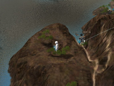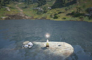 シャカトゥ・廃渡し場の西にある小さい池の水を汲んでいる人の隣辺りで。近くの探索ポイントから得られる知識によると、この池は「岩石地帯の乾かない泉」らしいです。ここら辺ではめちゃくちゃ貴重な水資源ですね。